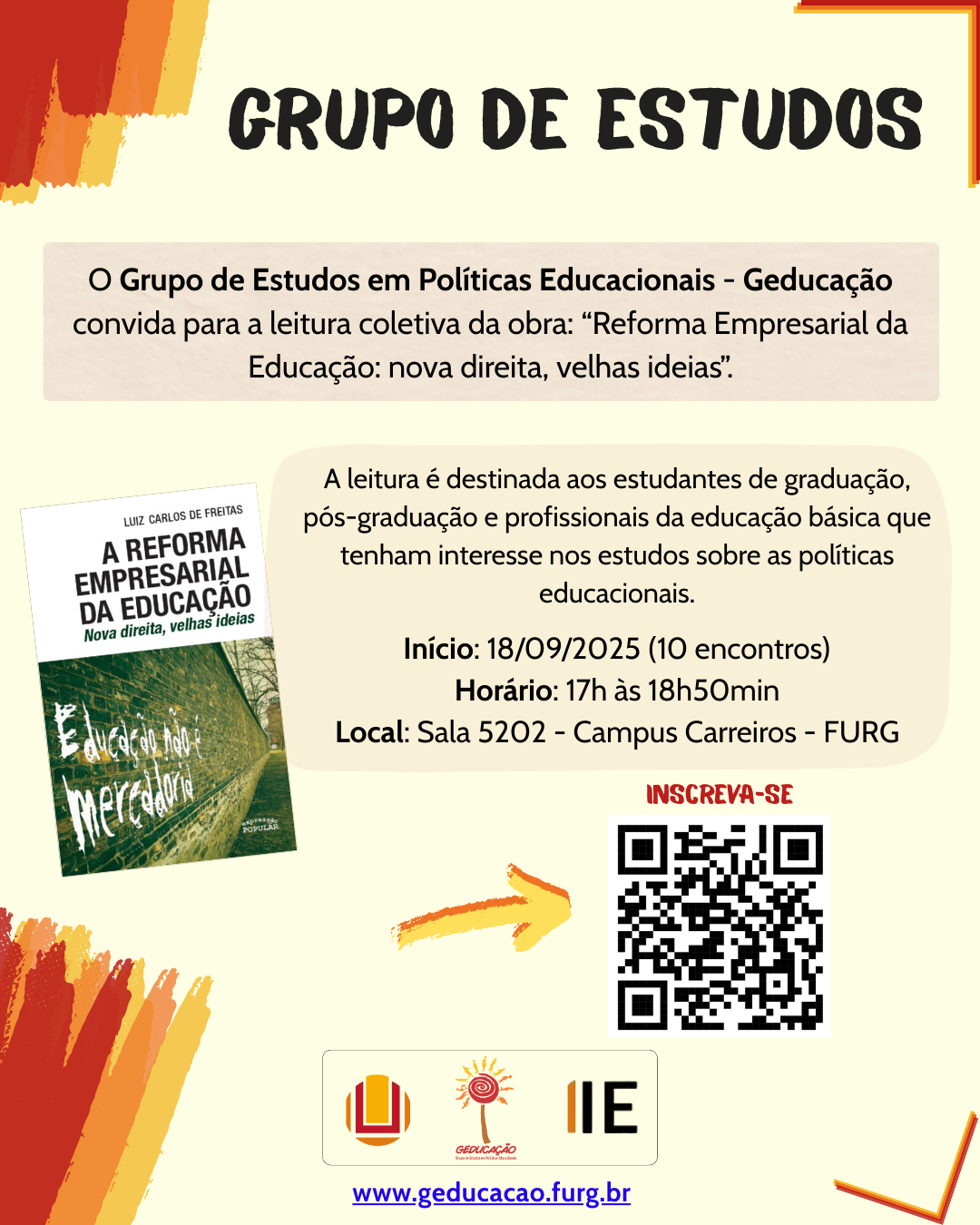 O grupo de estudos em políticas educacionais - Geducação realizará a leitura dirigida da obra "Reforma Empresarial da Educação: nova direita, velhas ideais". A atividade é destinada aos estudantes de graduação, pós graduação e profissionais da educação e visa a promoção de analises criticas sobre as multiplas formas de inserção do setor privado junto à educação básica.